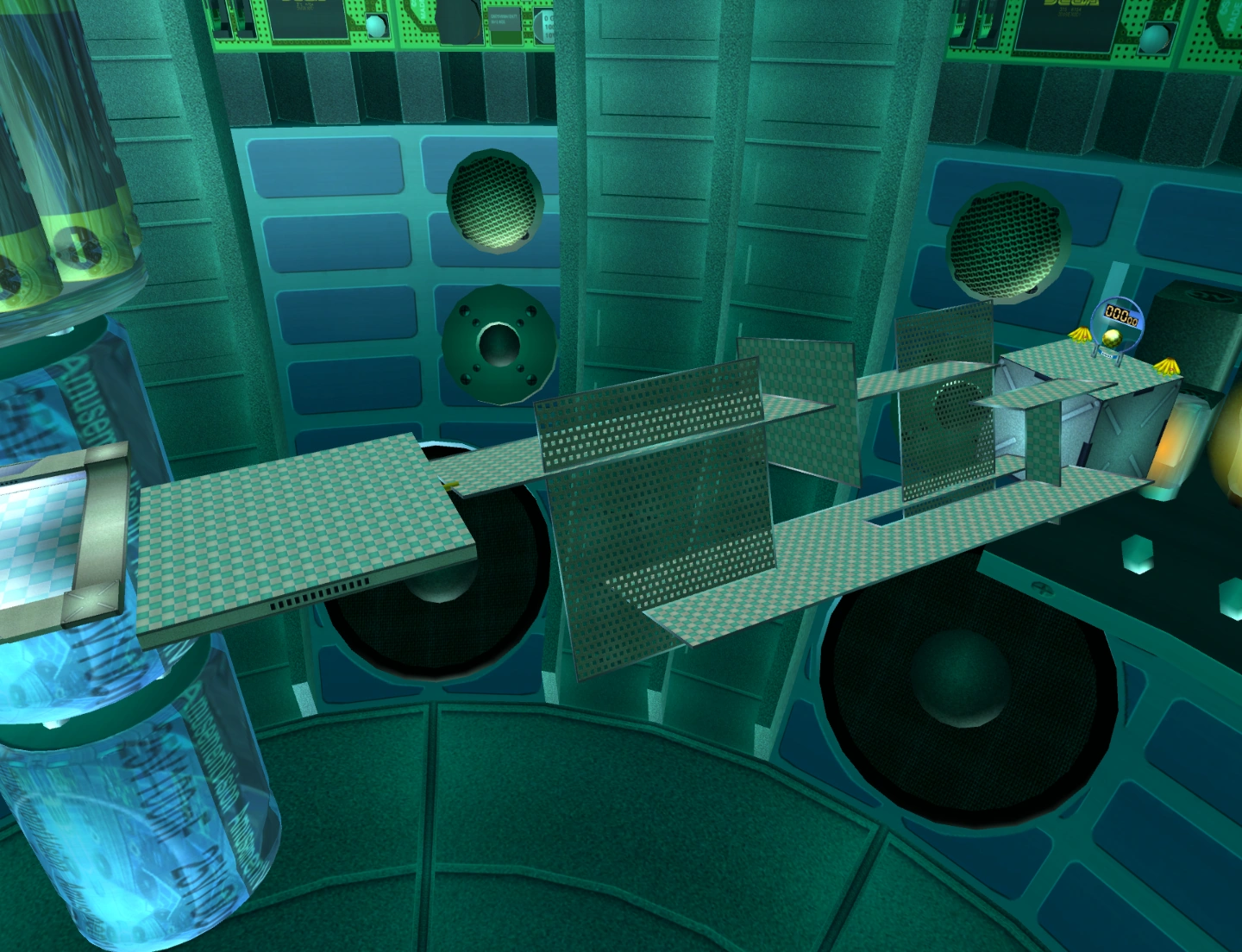 A giant rotating mass of protruding platforms serves as a 3-dimensional maze. It rotates clockwise for several seconds. Then it rotates counterclockwise for several seconds before repeating the cycle. The goal is on a cube platform behind the maze, and there are two banana bunches next to the goal.