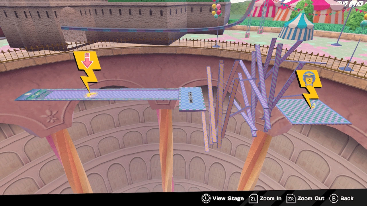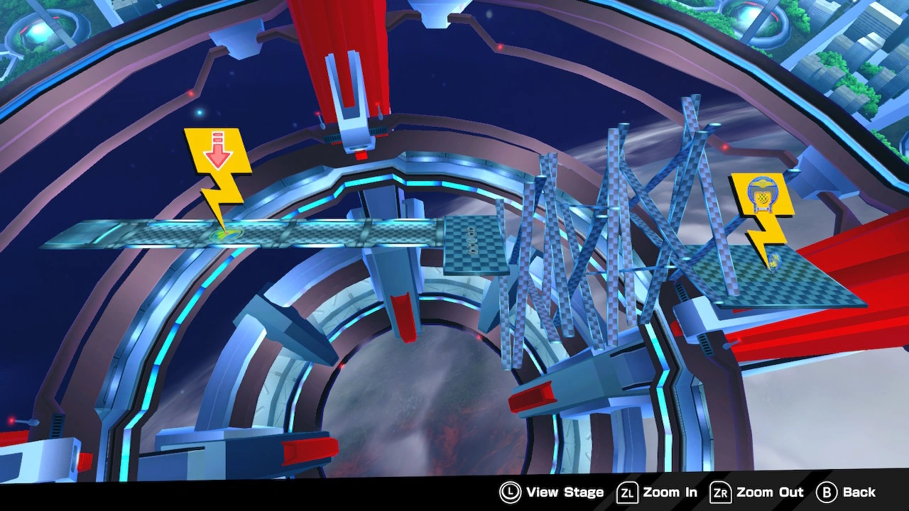 This stage has two platforms, along with short and wide, bead-like platforms. Rewind, reverse, play, fast-forward, and pause switches are on the first platform, and the second platform, on the other side of the bead-like platforms, has the goal. When played, the bead-like platforms will rotate wildly for several seconds and then form a straight path for a few seconds, with speed and direction depending on which switch is activated. Pressing the pause switch makes the bead-like platforms stop.