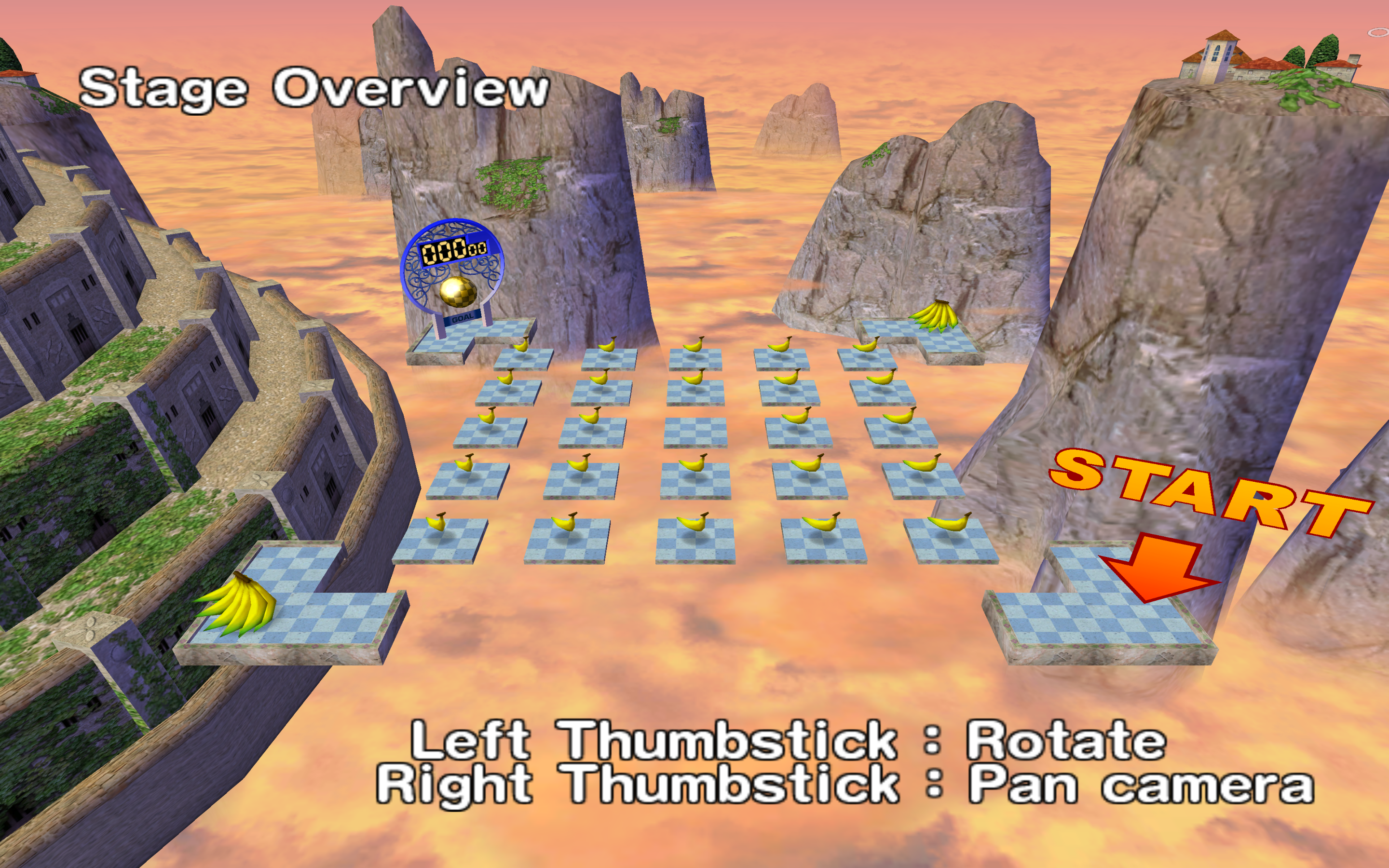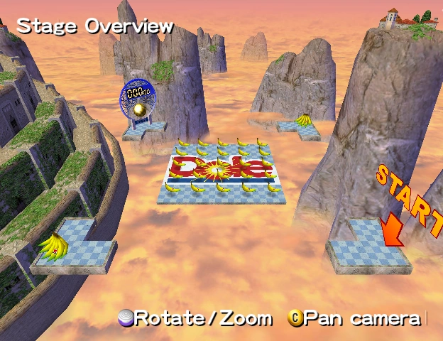 This floor is made up of a square made up of a 5x5 matrix of small square platforms. Around the stage are 4 corner platforms. The small squares move in and out, meeting the corner pieces as they go out, and joining together to form a solid square as they go in. The goal is on the corner across from the start. There are banana bunches on the other two corners. The squares when joined together contain a big Dole logo.