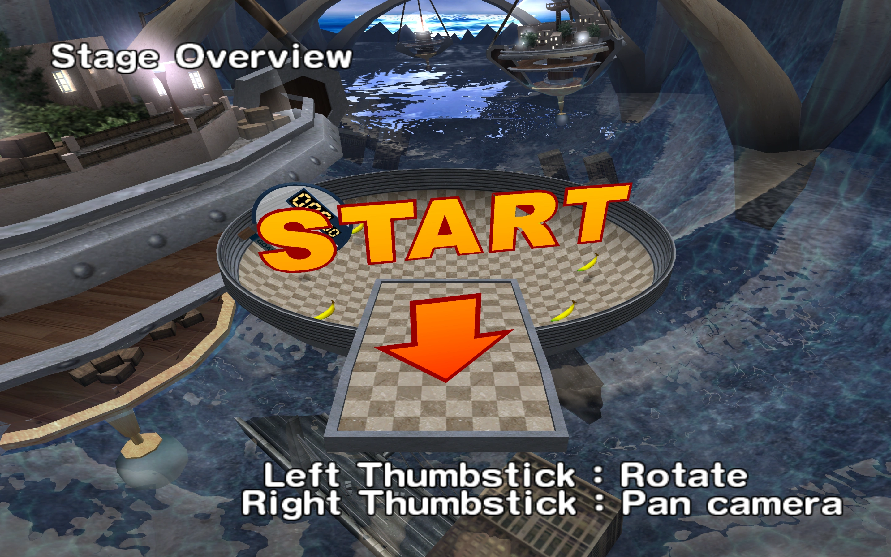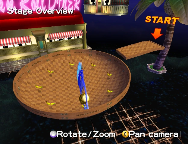 This stage features a bowl-shaped platform, hence the name. There is a slightly bent, rectangular platform in front of the bowl-shaped platform, on which the player starts. The goal is in the bowl-shaped platform at a steep angle. There is a circle of bananas in the bowl-shaped platform.