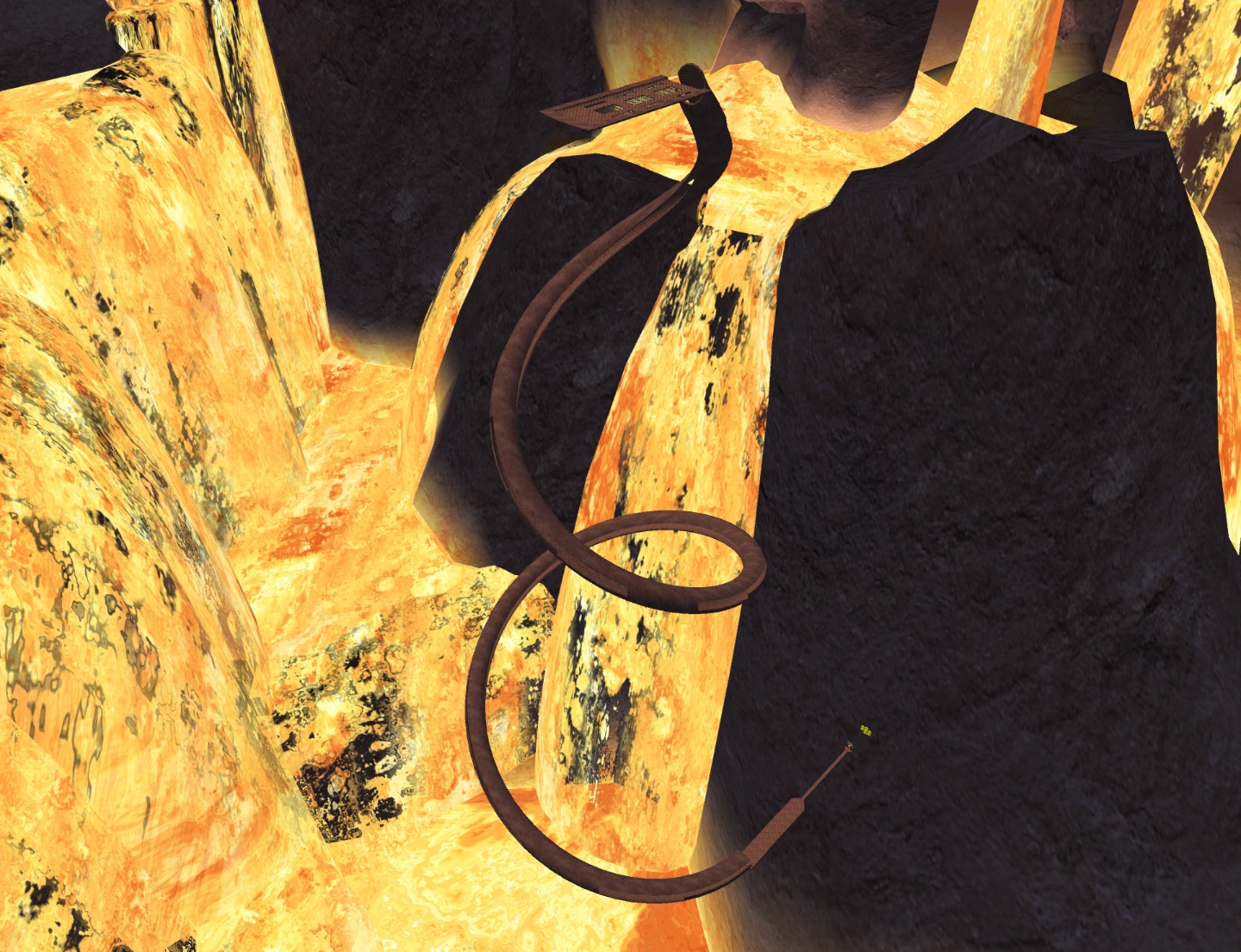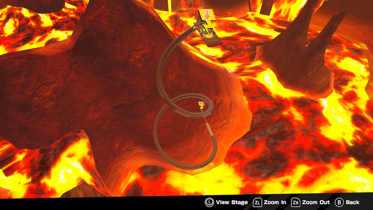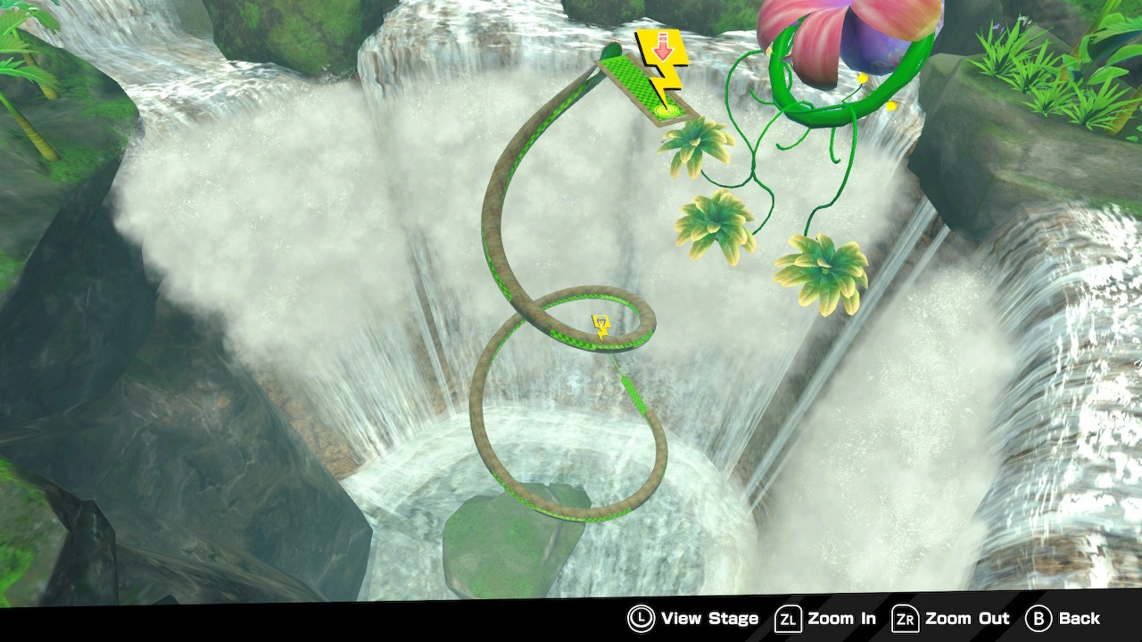 This stage is a large, coiled tube with holes cut out of its sides. At the end of the tube are two platforms, one with the width of the tube and one with half this width. The goal is at the end. There are some banana bunches a short distance from the goal, but you must pass through the goal at a high velocity to get to them.