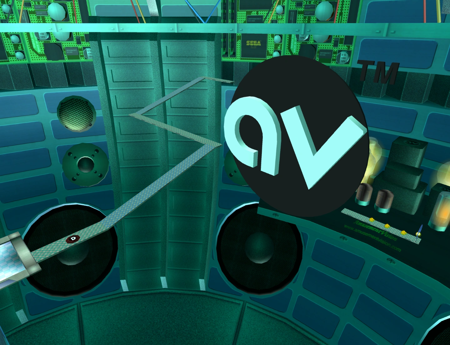 This stage features the Amusement Vision logo. There is a play button that makes the AV logo rotate. The goal is on the platform at the bottom right corner of the logo.