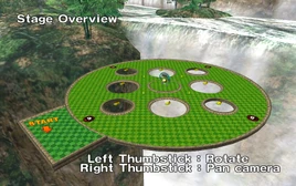 This stage is considered easy. It features a big circle with eight circular holes surrounding the goal, an elevated round platform the same size as the holes. In each empty circle, a banana bunch is in there. When the player starts, a play switch will be there in front of him or her. The stage will begin slowly rotating back-and-forth when the play switch is activated. There is also a pause switch and two fast-forward switches. You don't have to switch on the play button or fast-forward buttons to reach the goal, but it does open the player to some free, surplus bananas.