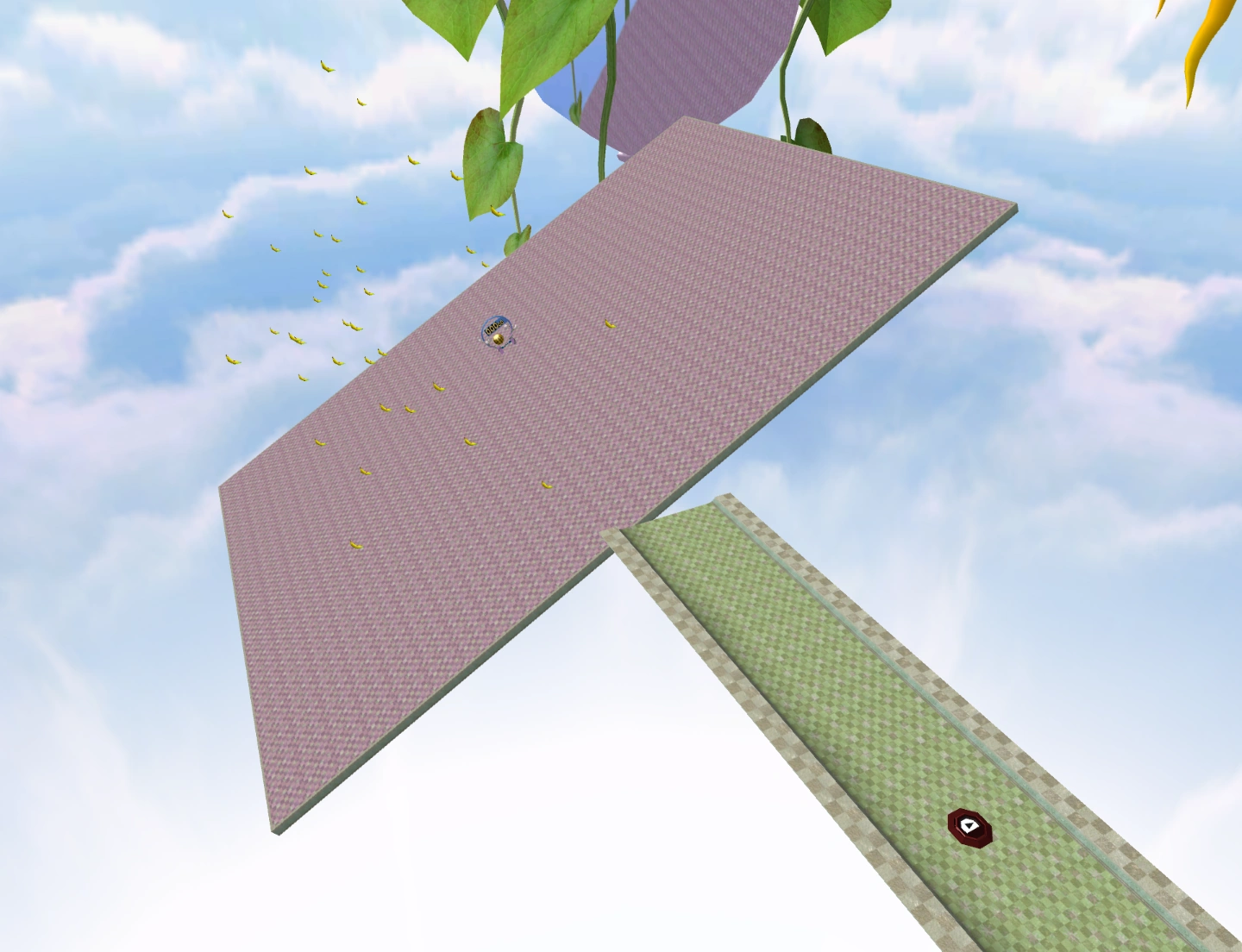 This stage features a large, rectangular platform. There is a play switch that activates the rectangular platform by tilting back and forth, somewhat like a seesaw. There are bananas located in the air above the rectangular platform, which will fall onto it when the play switch is activated.