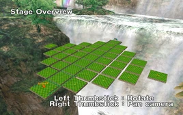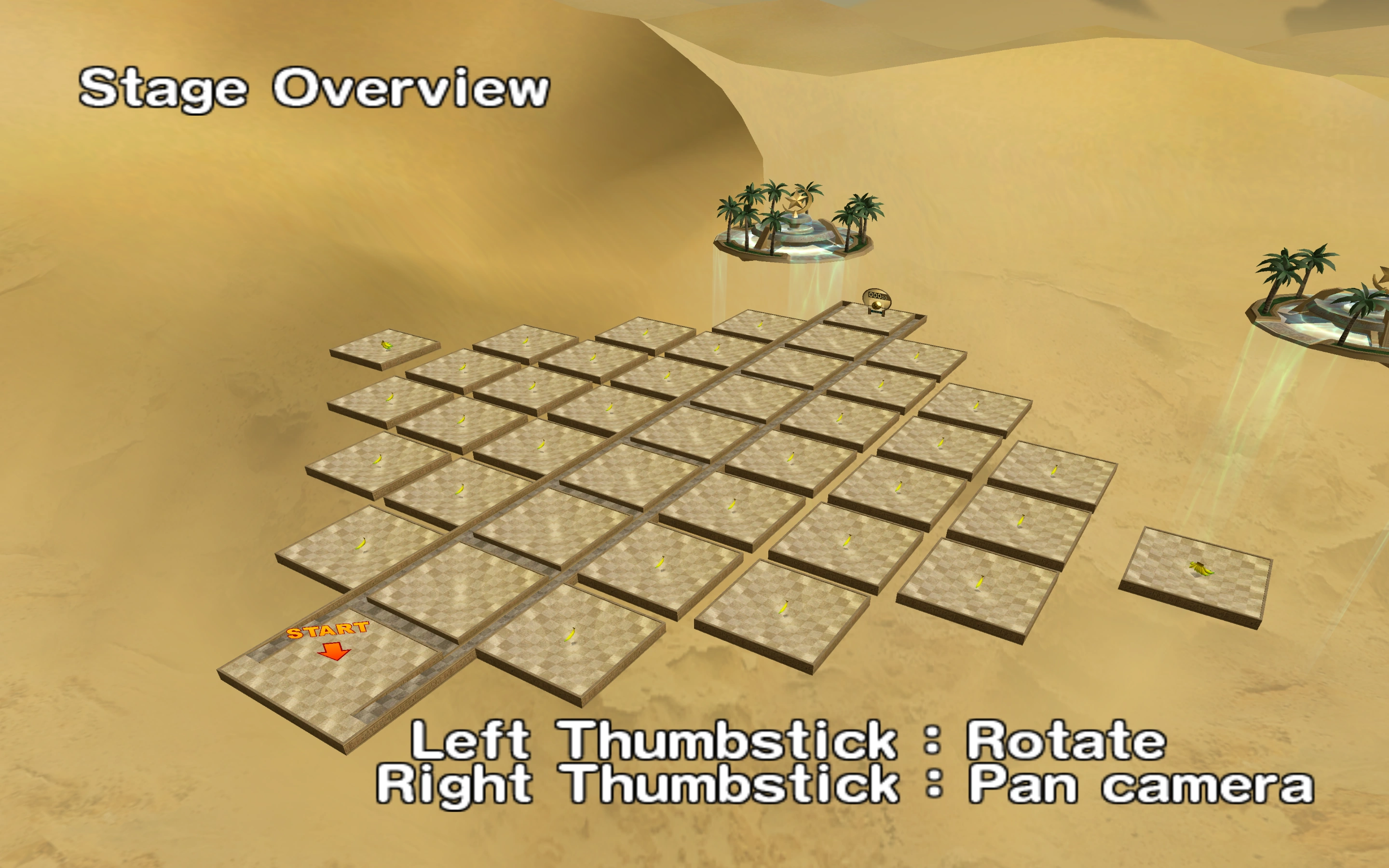 This stage has square platforms separated by gaps. Each platform is slightly indented and has a rim. the squares leading to the goal have rails and gutters surrounding them. So if the player misses, he or she can go back to the beginning and try again to get to the goal. Squares with bananas on them are separated and have no floor between them.