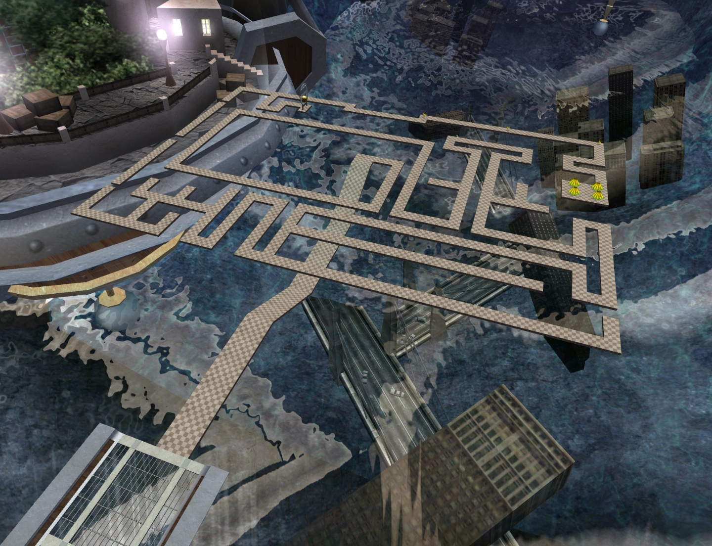 A narrow path slopes down and travels beneath part of a flat maze until it runs into a ramp that leads to the maze. The entire maze consists of one narrow path with lots of turns and occasional gaps that can be cleared with enough speed. The maze is so long that it is nearly impossible to follow the path to the goal before the time runs out. There are two single bananas on the path beyond the goal and four banana bunches at the dead end beyond the goal. The goal is located at a dead end on a small path that branches out of the main path, and it can be found near the upper left-hand corner of the maze.