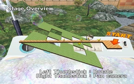 To get to the goal, roll along the straight path. Then, land smoothly onto the slanted platform at the very top, and then roll across as few of diagonally arranged, square-shaped platforms as possible to cross over to the other side. Be sure to angle yourself as well as possible to avoid falling through a square-shaped hole or to avoid falling off as you make your way to the goal. Once you are right by the goal, try your hardest to roll into it.