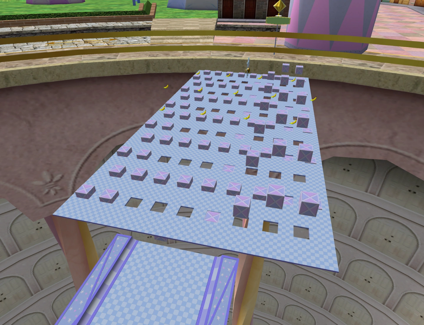 This stage is a large rectangle with lots of small, square holes. These holes are filled with cubes, which rise and fall in a wave-like pattern from side-to-side. Bananas float above the floor and can be reached by riding a cube to the top of its motion. The goal is at the end of the floor in between two cubes.