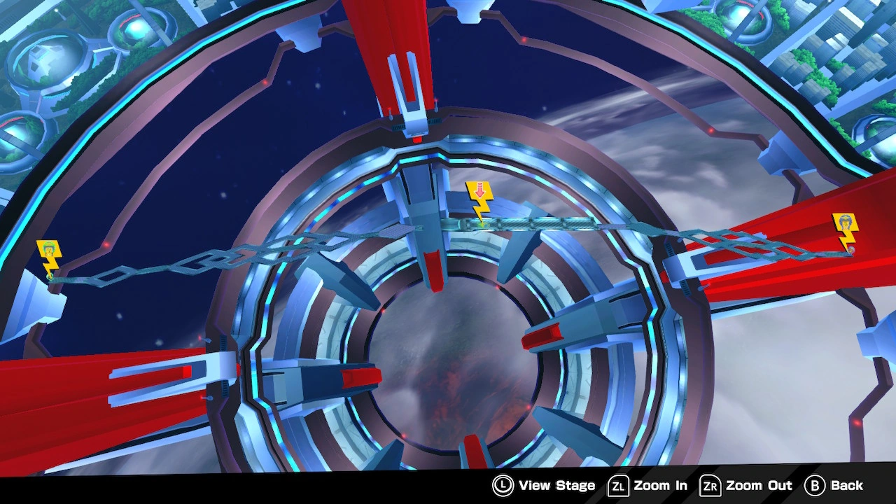 This stage has two platforms. Both are long with diamond-shaped holes and areas. The goals are at the end of each. There is no flat, rectangular platform at the start of the green goal platform. The green goal platform is longer than the blue goal platform, and it is more tilted down.