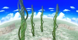 The world takes place between giant beanstalks that tower from the base of the jungle, piercing through the clouds above. Down below is an expansive jungle with cliffs and canyons running through it, covered by mist. The sky is clear and blue, with a few clouds visible. Surrounding some of the stages are potted plants where butterflies and ladybugs reside.