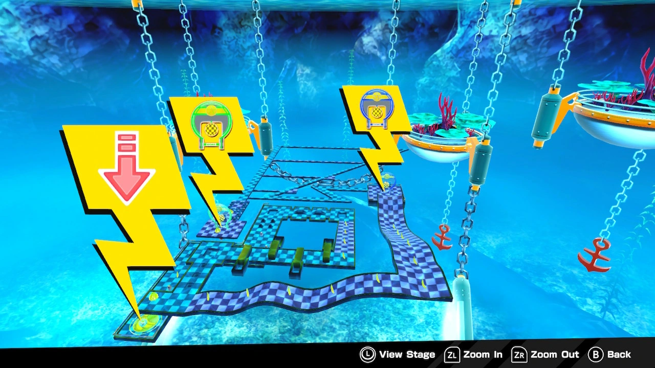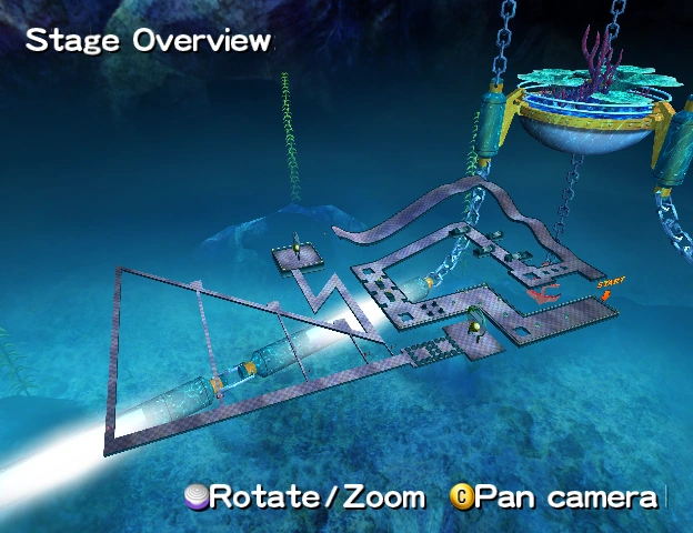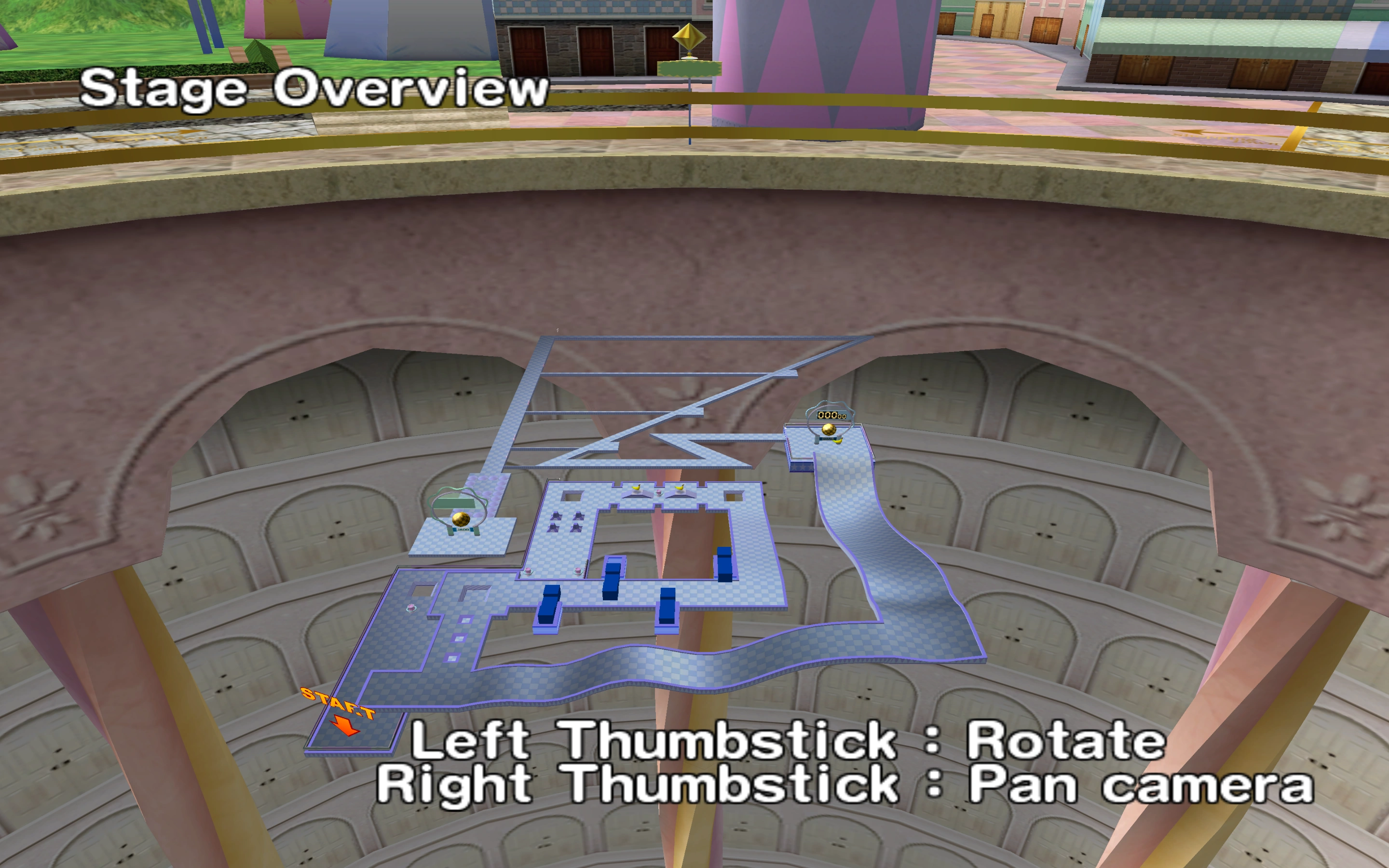 This stage features a pathway with lots of turns. There are bumpers, slopes, holes, pyramid-like obstacles, mini slopes, and sliding mechanisms along the way. There are also some guard rails. There is another pathway at the end, leading to five paths of varying widths and lengths. These paths lead to a second goal, a green goal. The narrower a path is, the shorter it is. The paths are 0.1, 0.2, 0.3, 0.5, and 1.0 in width. There are bumps in front of the green goal.
