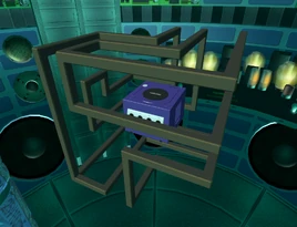 The stage is an exact replica of a Nintendo GameCube, the system on which Super Monkey Ball 2 was originally released. The system is surrounded by metal wires that resemble the GameCube's logo when viewed from a certain angle.