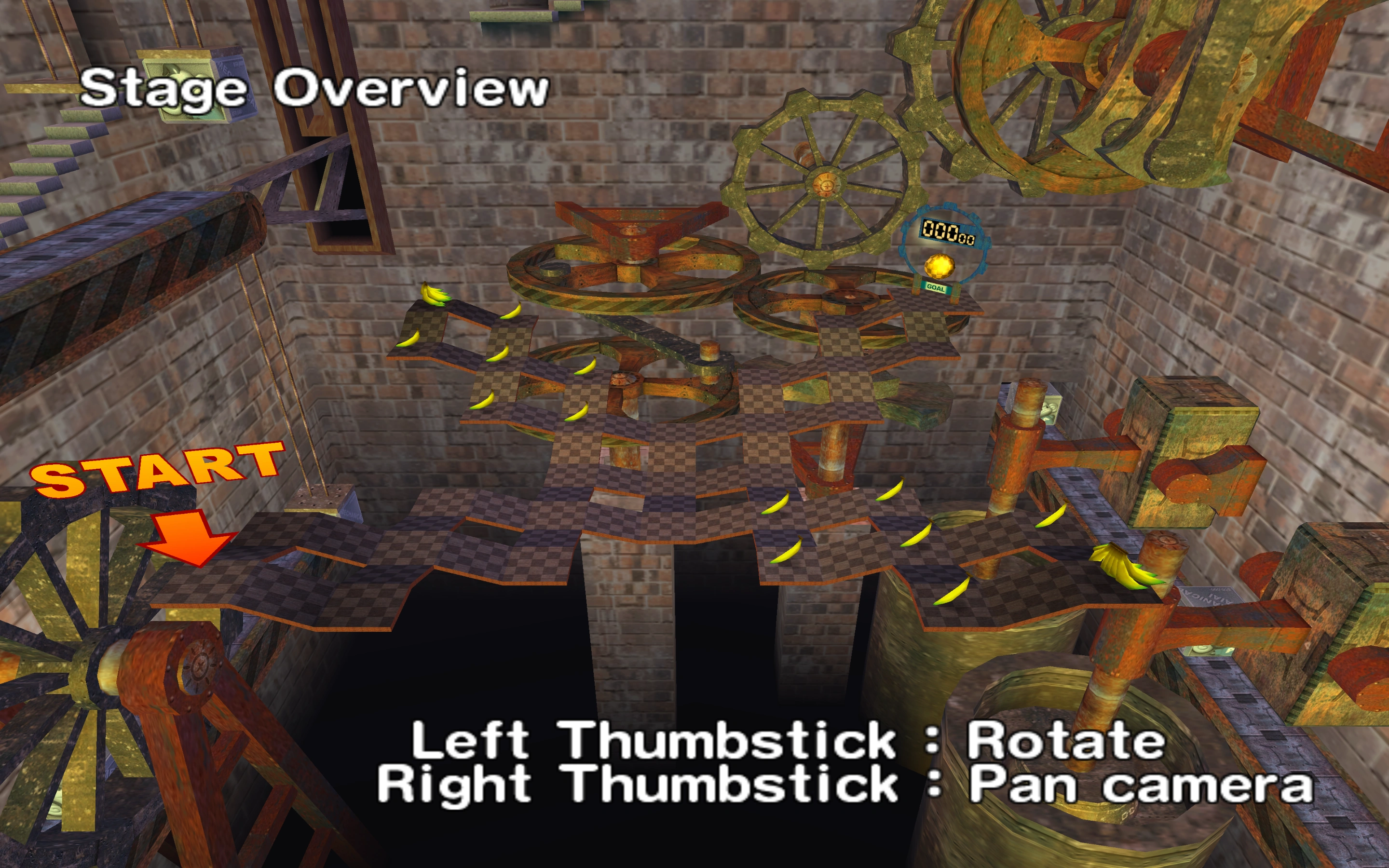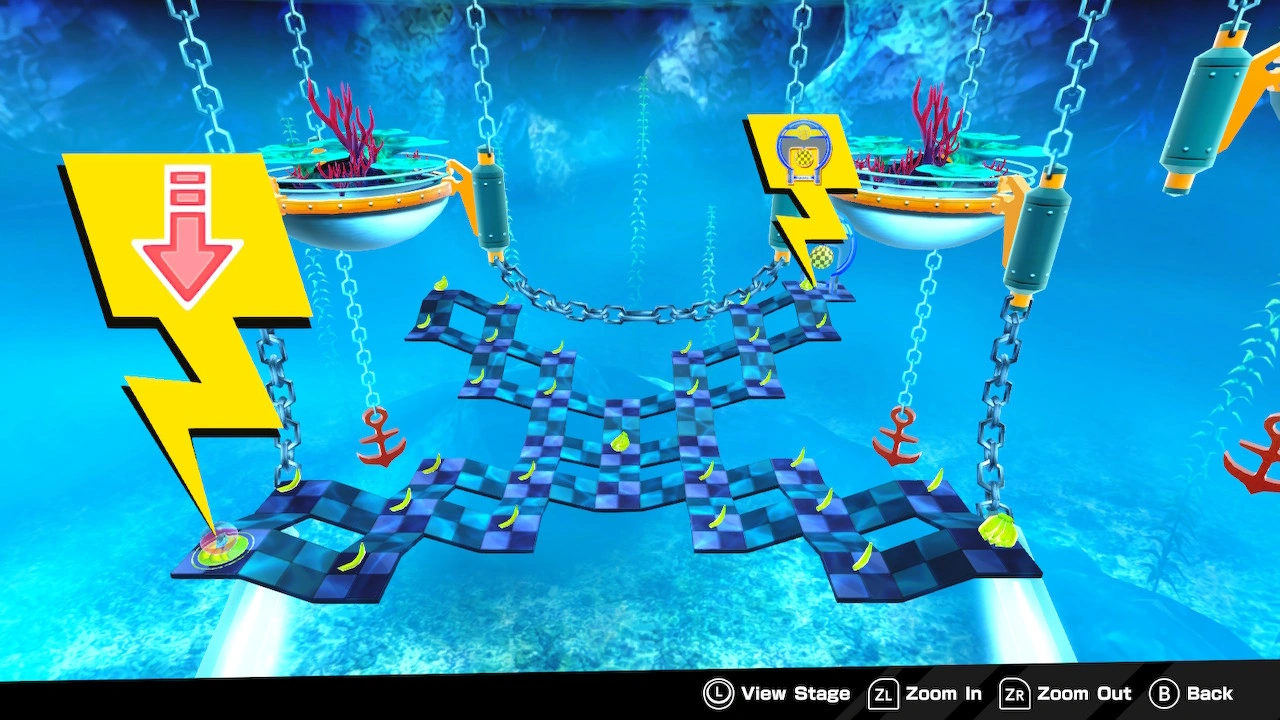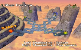 It features a platform composed of four intersecting sections of small, square-shaped slopes. There are small, flat, square-shaped areas in between these slopes. The slopes decrease in steepness outwardly to inwardly. The goal is at the end of the section opposite from the starting position. The other sections have bananas.