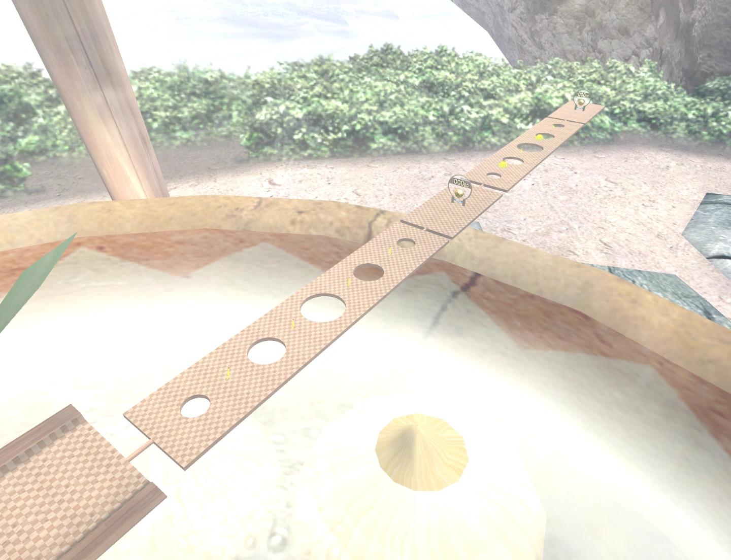 The stage consists of two seesaws with holes in them. One leads to the blue goal, and the other is past that, leading to the green goal. The second seesaw tilts faster than the first seesaw, giving it a greater challenge.