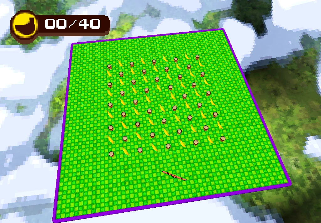 This stage features a large, chartreuse, square-shaped platform with violet sides. There are bumpers arranged diagonally on the platform with bananas in between them. There are forty bananas altogether.