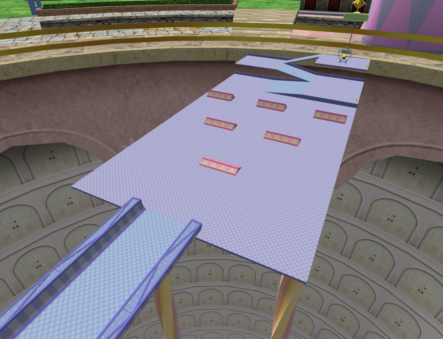 This stage is considered easy. It features three large slopes, hence the name. There are flat platforms adjoined to these slopes, with one of them having the goal. There is also a large, rectangular platform with six sloped, triangular prisms on it.