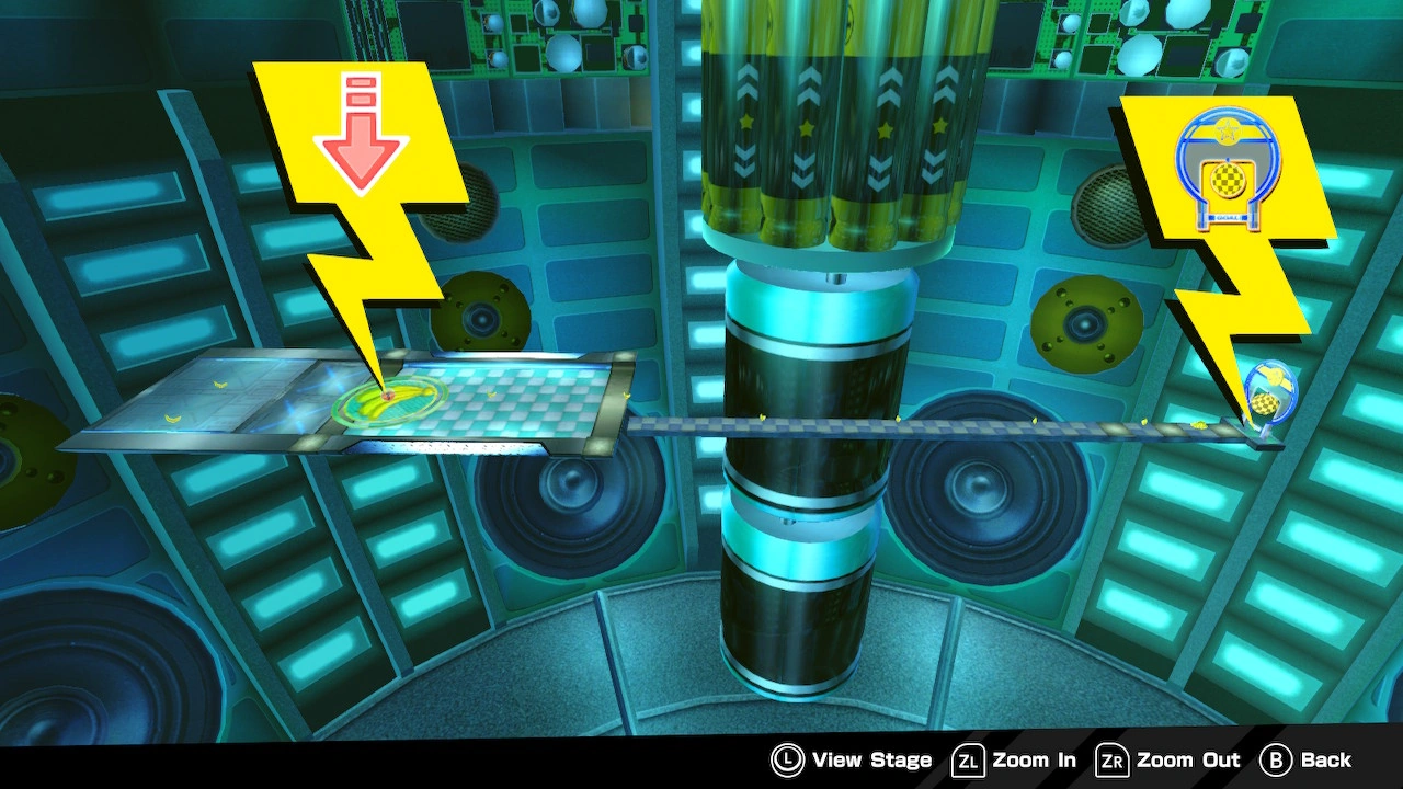 To get to the goal, you have to go to the sections of the stage that aren't moving by being between them and moving forward when possible. When the parts do rotate, they go very fast, so you'll have to be quick, but you will also need to make sure to brake fast so that you won't end up on the following, moving platform from where you are. Repeat this pattern until you make it to the goal.