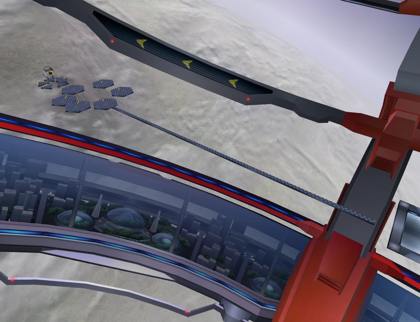 A long, narrow path leads to six hexagonal platforms that stagger in and out until they touch each other, remaining motionless for a short time. The farthest hexagon moves forward and towards six small, triangular platforms that outline a hexagon. These triangles also stagger in and out until they touch each other, staying in place momentarily. The goal is located on the farthest triangle from the starting point.