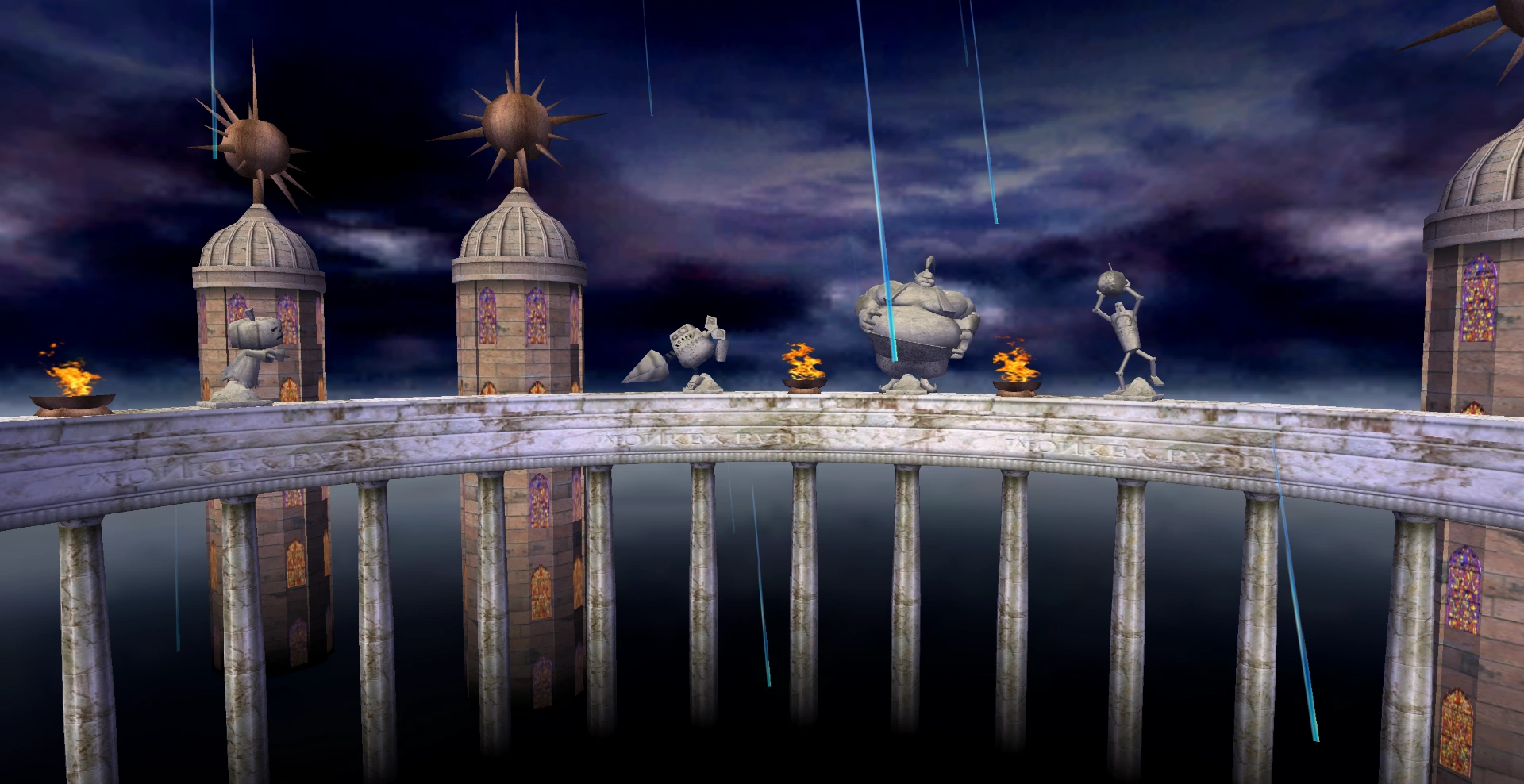 This world takes place in a stone colosseum at night, during a thunderstorm. Stages are placed in the center of the colosseum. On its walls are various statues and flaming torches. Surrounding the colosseum, several towers can be found which are tipped with sun statues. Rain constantly pours down upon the stages, creating a mirror effect on flat surfaces.