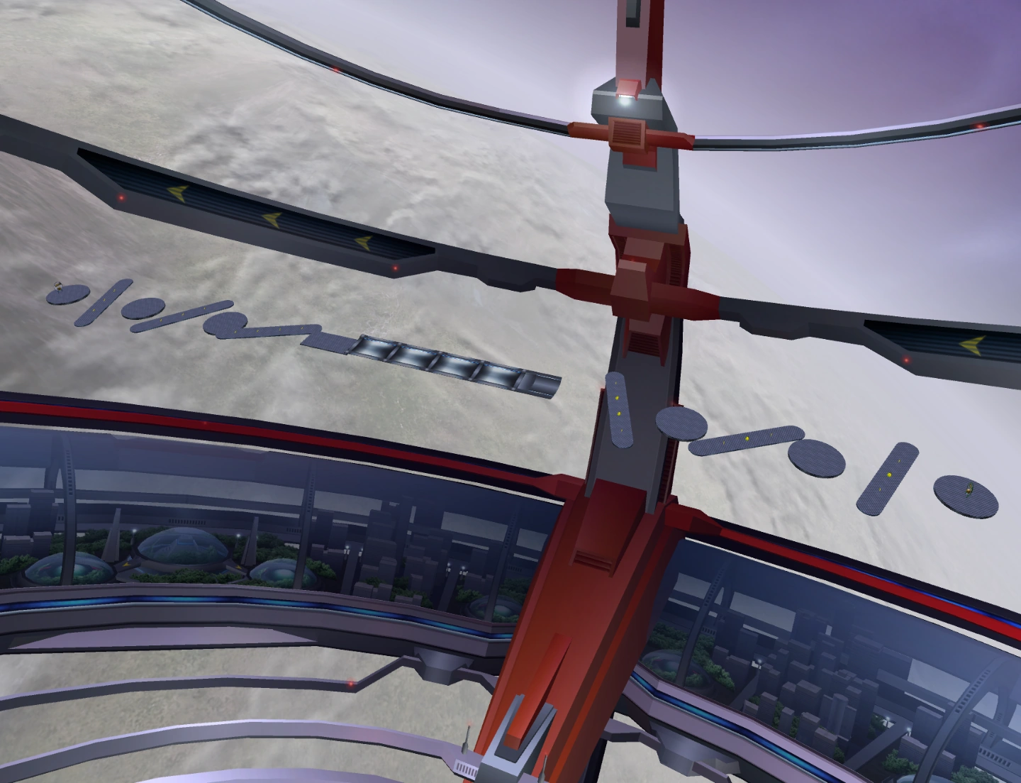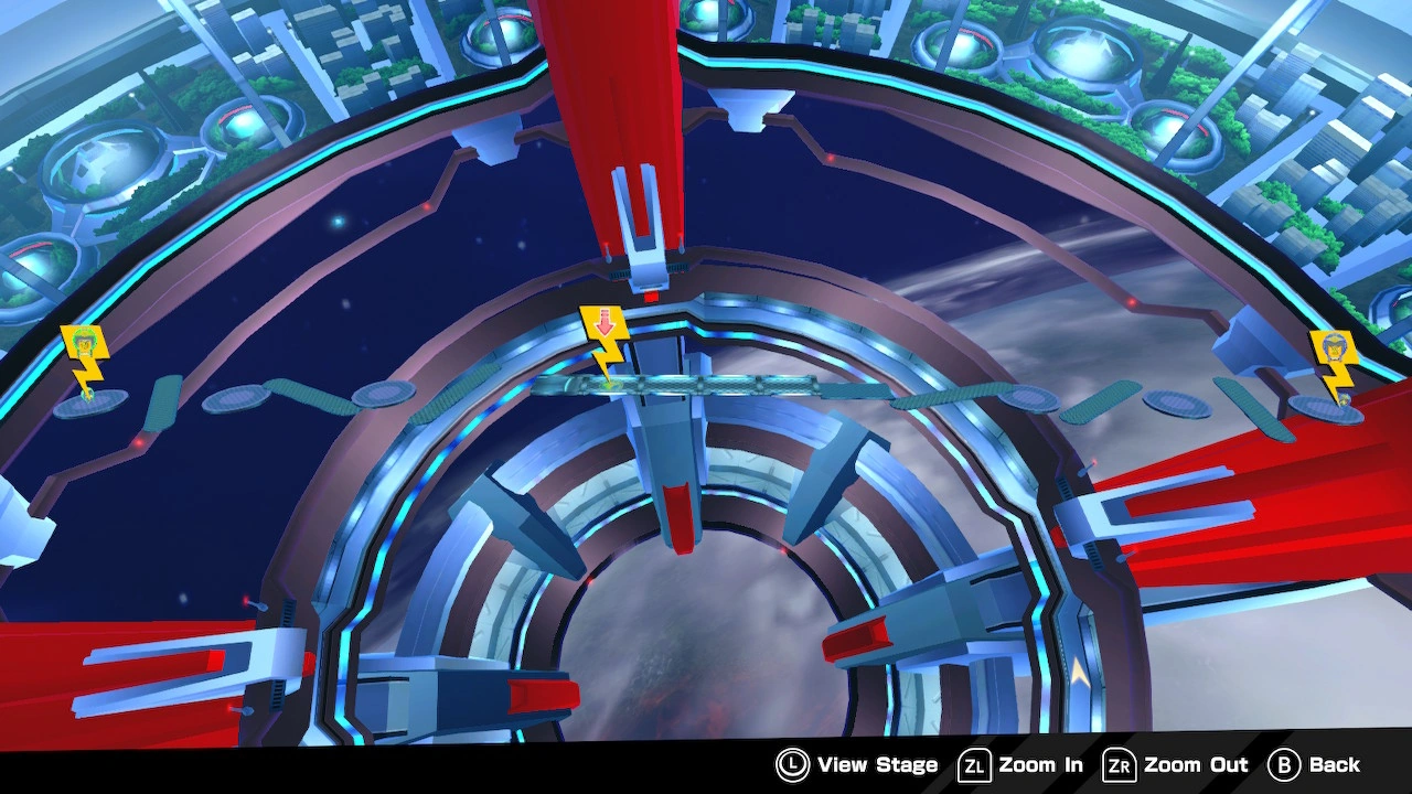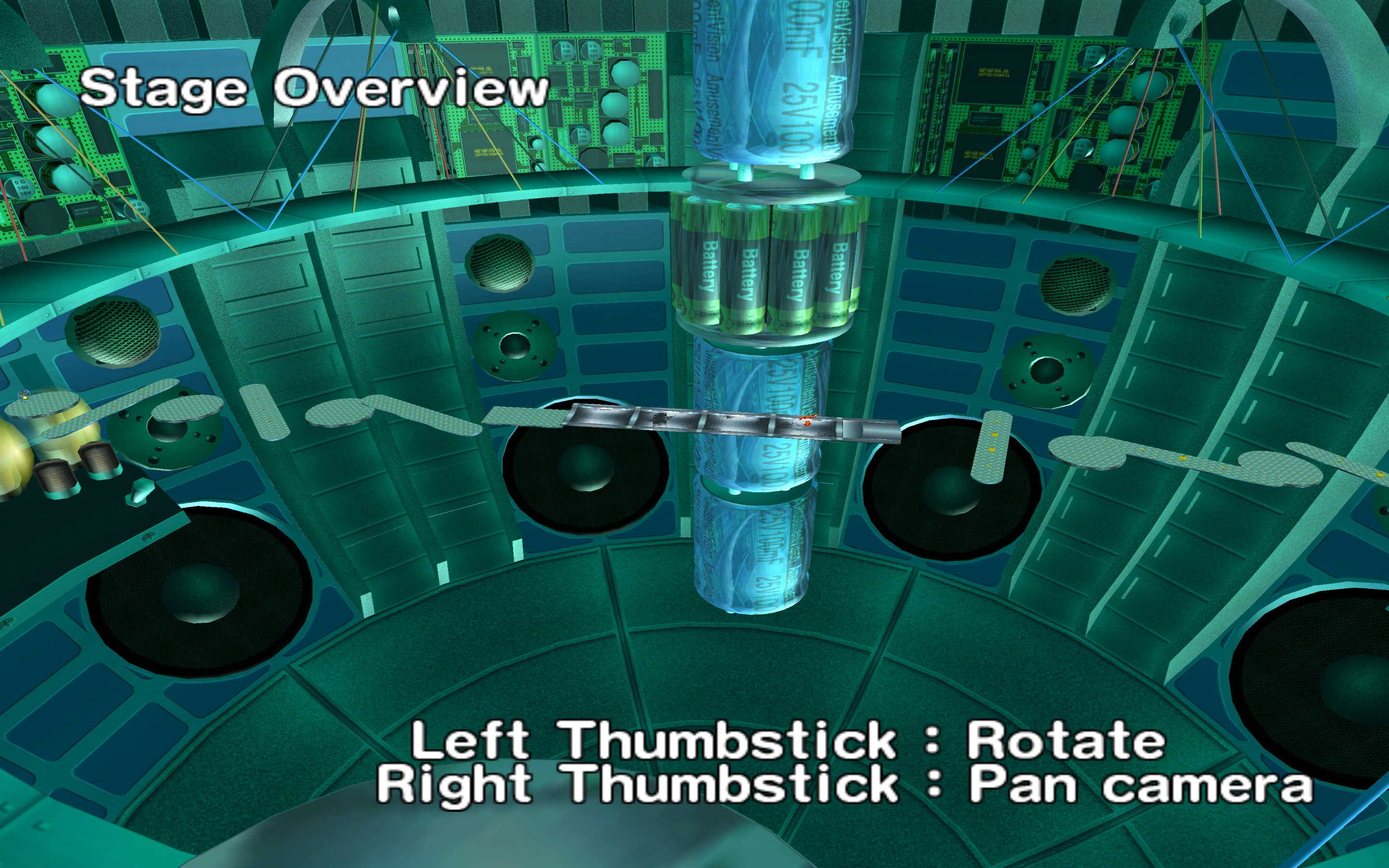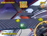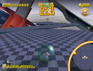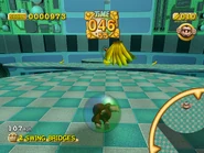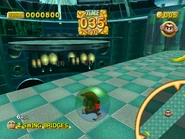 The stage involves several bridges that move in a pattern, making it where you can't always cross them. There are two sets of bridges, one in front of the starting platform, which has bridges moving sequentially fast in a pattern, and one rather far behind, requiring a running start to make it on, also getting sequentially fast with each bridge. There is a platform right before the blue goal set but not before the set leading to the green goal.