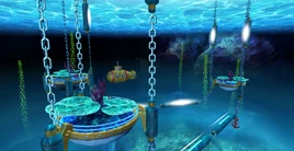 This world takes place in the ocean. There is a submarine with a Dole and Amusement Vision logos on it, as well as three large platforms connected by chains to giant safety rings at the surface. There is also coral growing out of each platform. At the bottom of this area, there is a rocky floor with a gaping trench in the center.